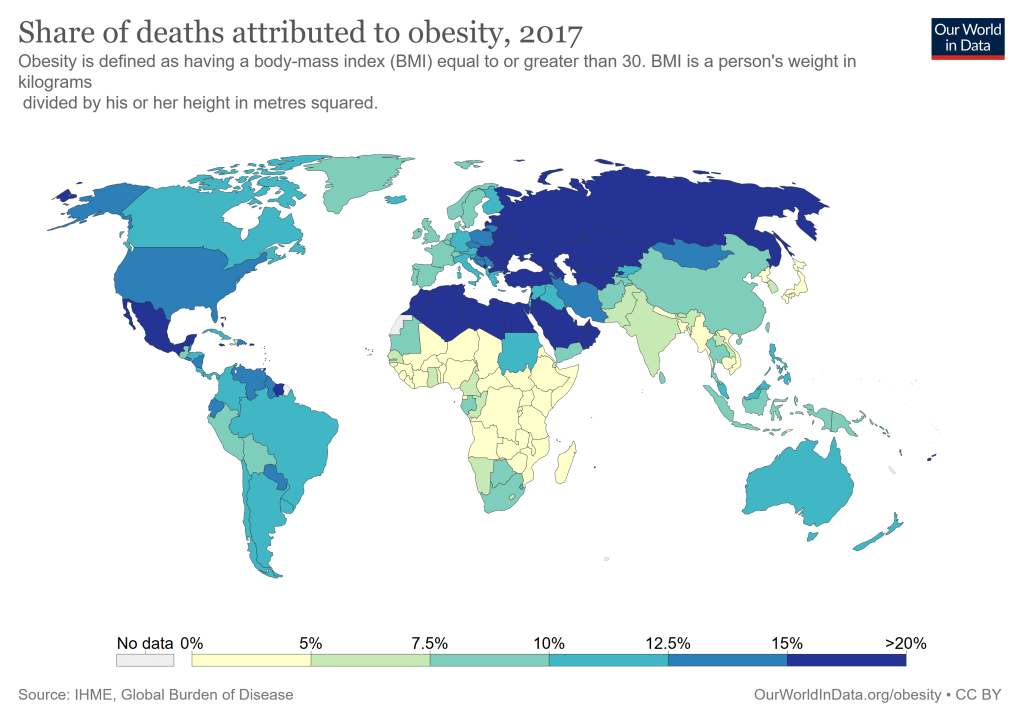 Hay que tener en cuenta que la obesidad es un problema de salud cada vez más prevalente, cuya incidencia va en aumento. En Our World in Data podéis encontrar información respecto a como ha variado el porcentaje de individuos con sobrepeso y obesidad desde 1990 hasta la actualidad, así como las diferencias entre sexos, tramos de edad…, tanto a nivel mundial como en países específicos. Es importante destacar que a nivel global se ha observado un aumento del 4’5% (1990) hasta el 8% (2017) en el número de muertes debidas a la obesidad. Además, también ha crecido su consideración como factor de riesgo asociado a muertes prematuras en las estimaciones de muertes a nivel mundial asociadas a diferentes factores de riesgo realizadas por el Global Burden of Disease y publicadas en la revista Lancet.