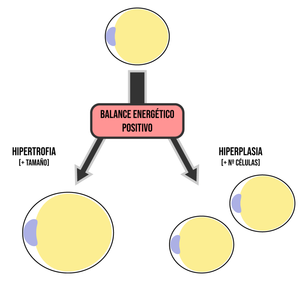 Veo bastantes caras dubitativas en la sala, así que creo que será mejor realizar una pequeña introducción. En primer lugar debéis saber que es el balance energético. Este término se define como la diferencia entre la energía ingerida por la alimentación y la que es gastada (metabolismo basal, ejercicio físico, efecto térmico de los alimentos…). ¿Qué ocurre con este parámetro en individuos obesos? Se ha observado que en este tipo de individuos existen desajustes entre ingesta y gasto calórico que se acumulan, dando lugar a un balance energético positivo. Como consecuencia, se almacena el exceso de energía en forma de grasa, lo que conlleva ganancia de peso y expansión del tejido adiposo blanco (WAT). Dicha expansión puede ocurrir respecto al número de células (hiperplasia) o su tamaño (hipertrofia), aunque se ha observado que en torno a los 20 años el número de adipocitos de un individuo se encuentra en equilibrio, renovándose únicamente en torno a un 8% de ellos cada año. Por ello, la expansión del WAT en pacientes obesos suele tener lugar principalmente mediante hipertrofia.
